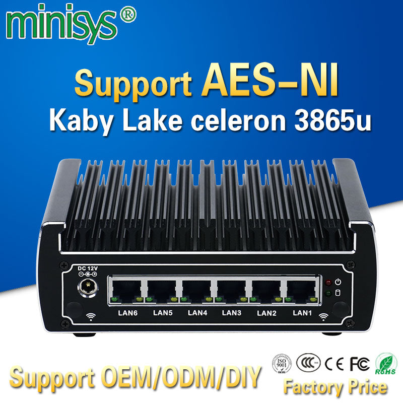 pfsense computers intel kaby lake celeron 3865u dual core fanless mini pc 6 gigabit lans firewall router support AES-NI 4*USB3.0