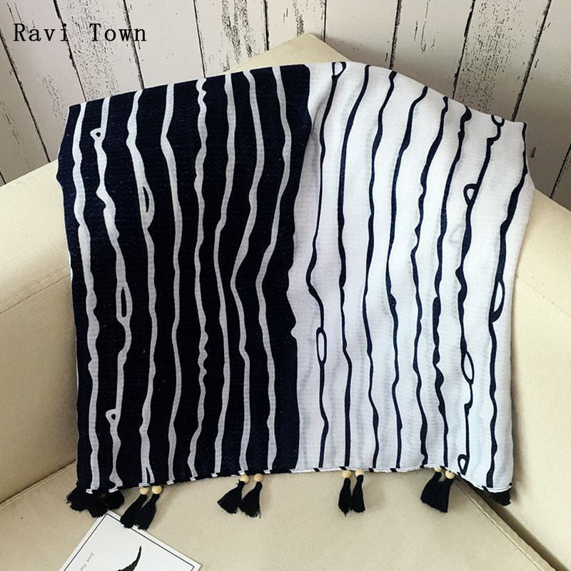 Ravi Town 2017 Autumn Winter Scarf Literary Black White Striped Cotton Linen Scarf Warm Tassel Women Scarves SC6015