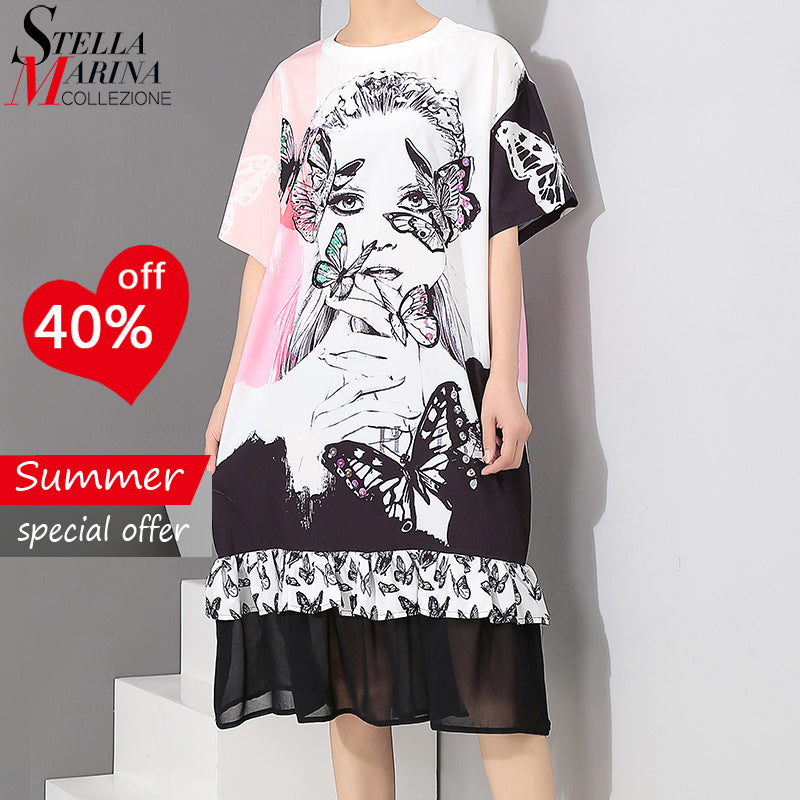2018 Korean Style Summer Clothing Women Cute Wear Midi Cotton Dress Short Sleeve A-line Girls Casual Printed Loose Dresses 3586