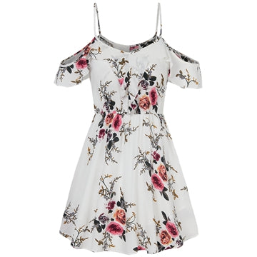 Timeson Summer Floral Print Women Chiffon White Dress Ruffle Off Shoulder Spaghetti Strap Female Tunic Girl Casual Beach Dresses